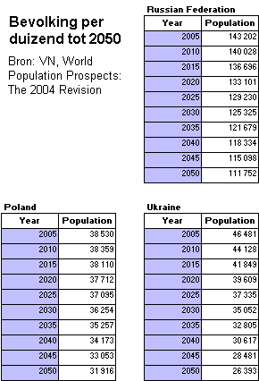 Onderstaande tabel laat de voorspelde bevolkingsafname van de drie landen in de regio met de grootste bevolkingsomvang zien, namelijk Rusland, de Oekraine en Polen. |